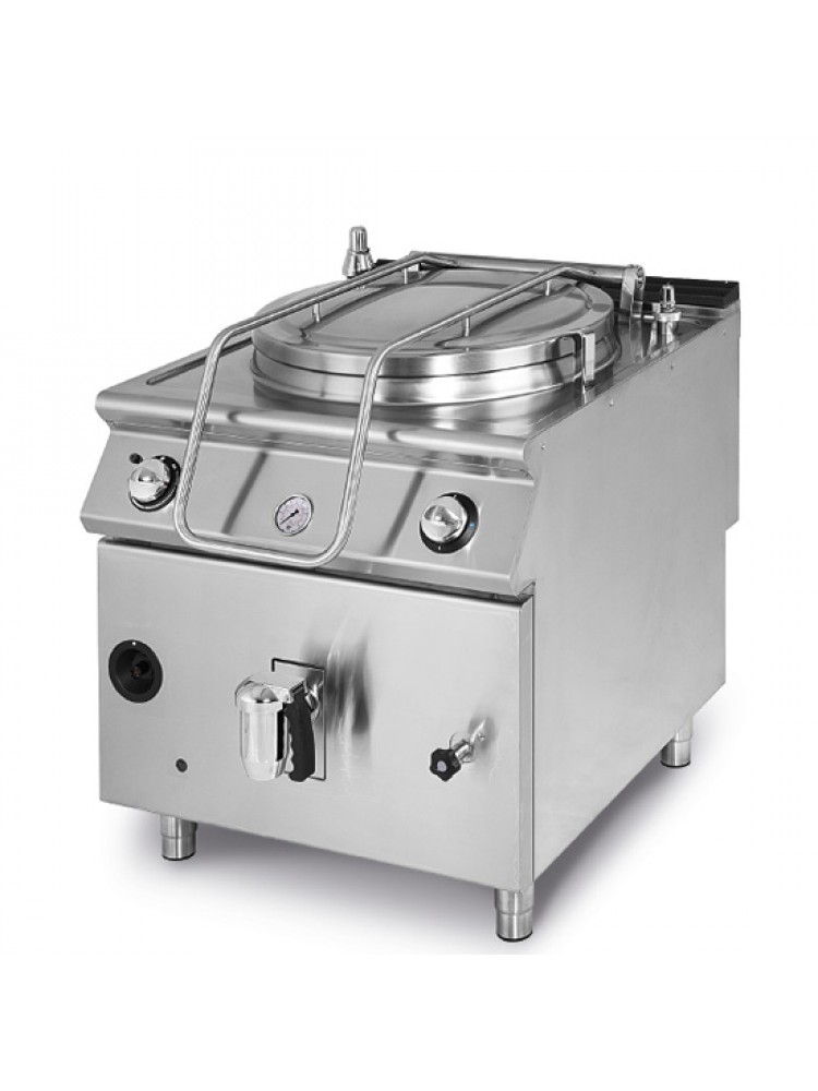 Material construído em aço inoxidável, conduta em ferro fundido esmaltado, controlo de aquecimento por regulador de energia, enchimento de água por torneira regulável, válvula de segurança, controlo do nível de água acionado no nível mínimo com a luz indicadora, botões especiais para evitar a penetração de água no painel de controlo.